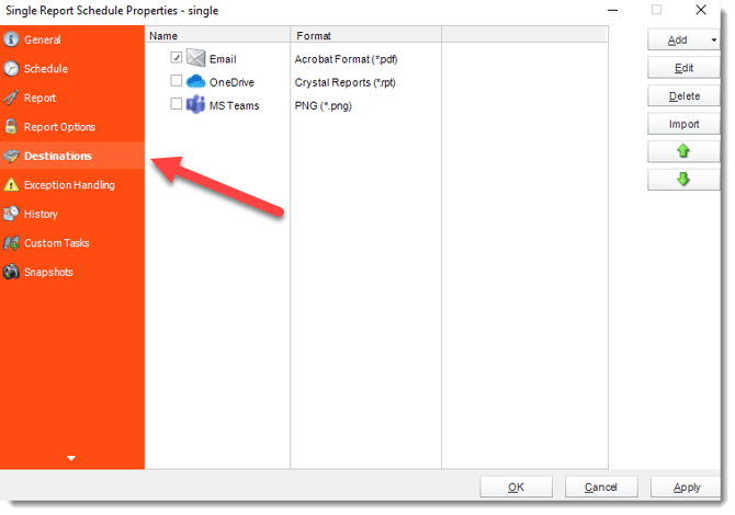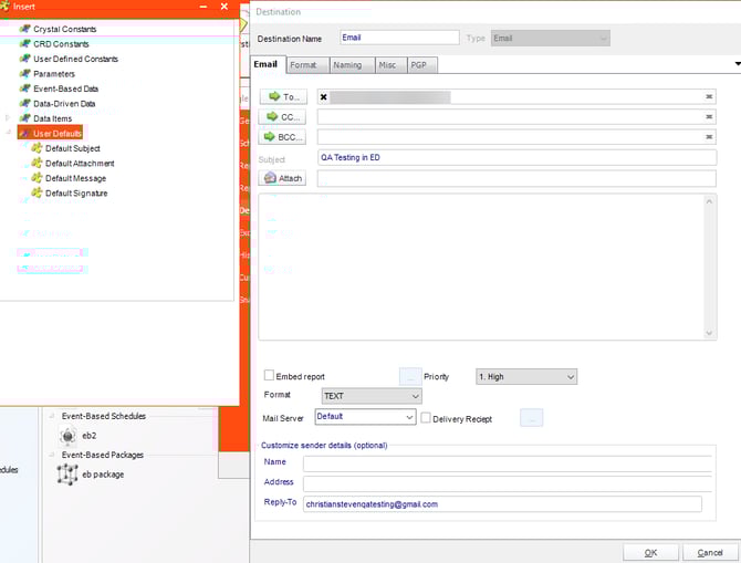Using the Email Destination you can send Crystal reports embedded in emails; or send emails in HTML or plain text with reports as attachments. You can use Inserts to customize the message body, use mailing lists & much more.