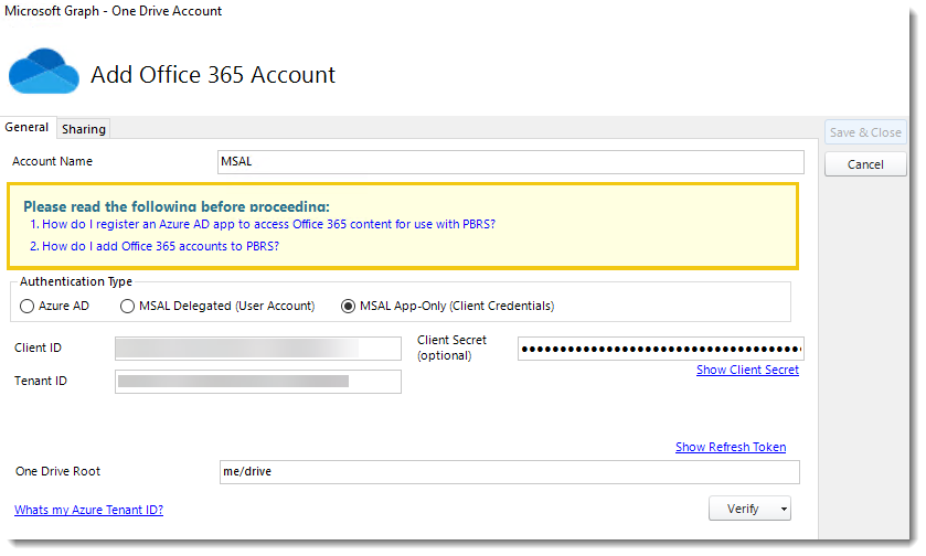The Office 365 account is added to PBRS.