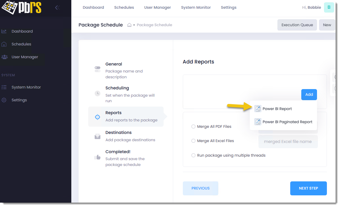 Step 8 - In the Reports section, click Add and then Power BI Report to add a Power BI report to the package schedule.