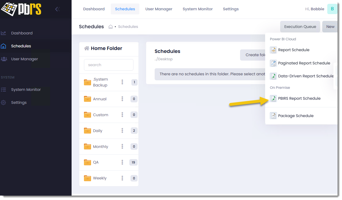 Step 1 - To create a new schedule for a Single Power BI on Premise Report in the Web Application, begin by selecting the "New schedule" drop-down menu. From there, choose the option for "PBIRS Report Schedule".