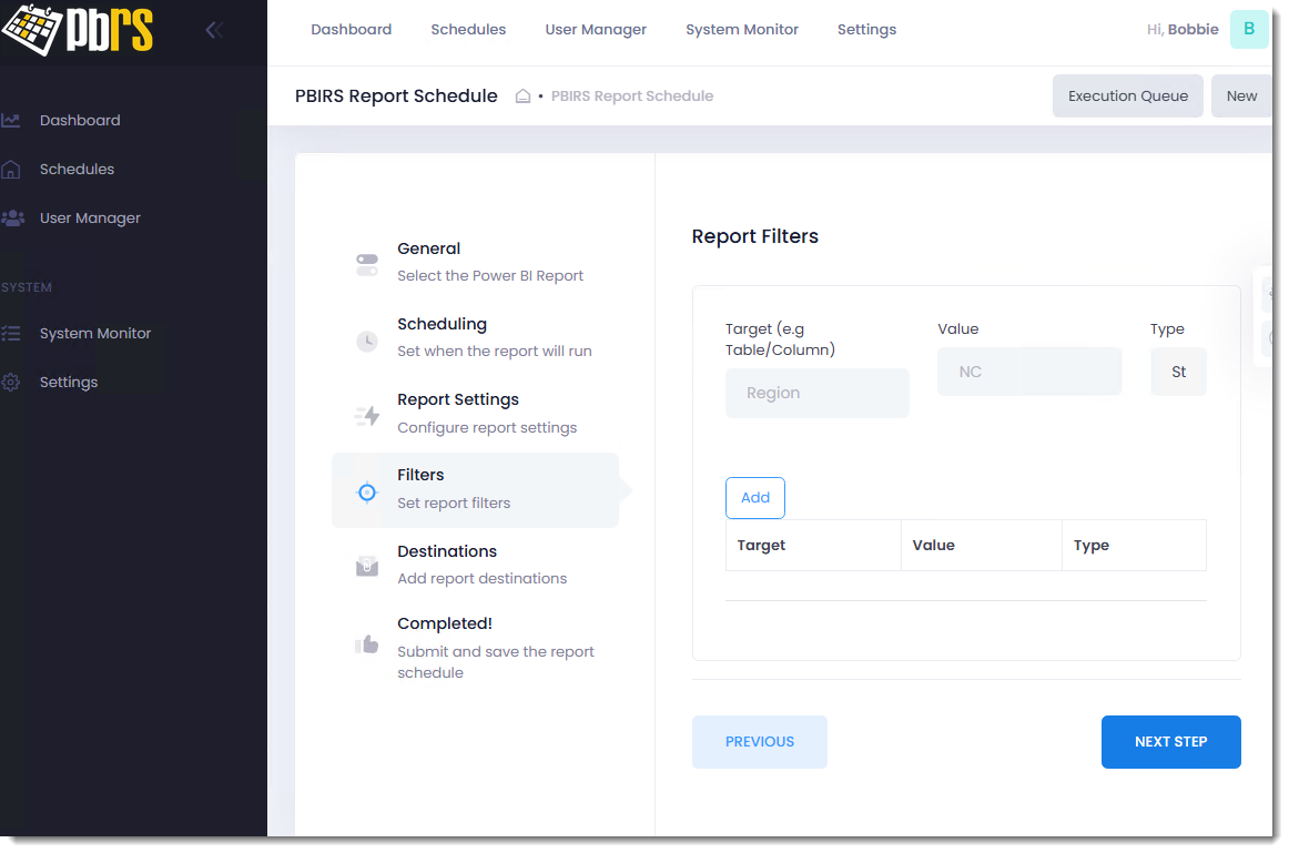 Step 11 - To add a Report Filter, go to the Report Filters section and in the Target box enter your table or column. In the Value box enter your value.