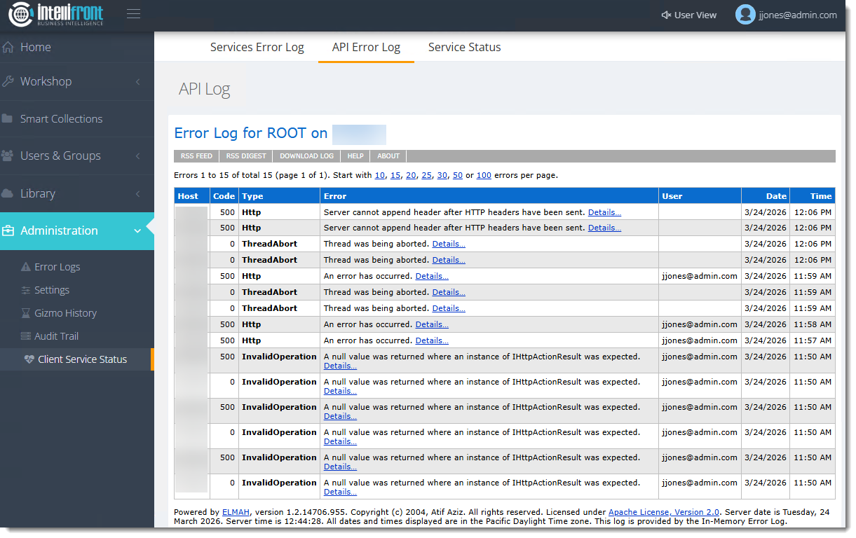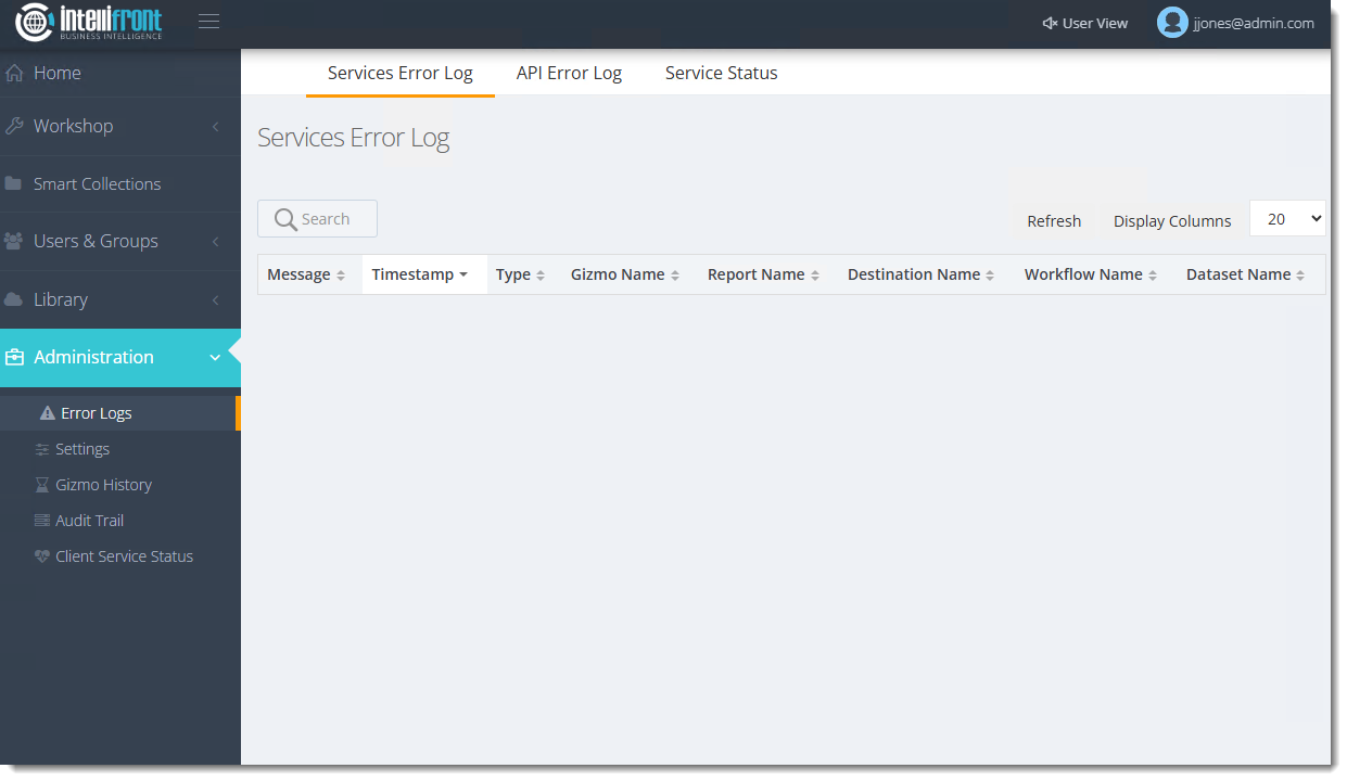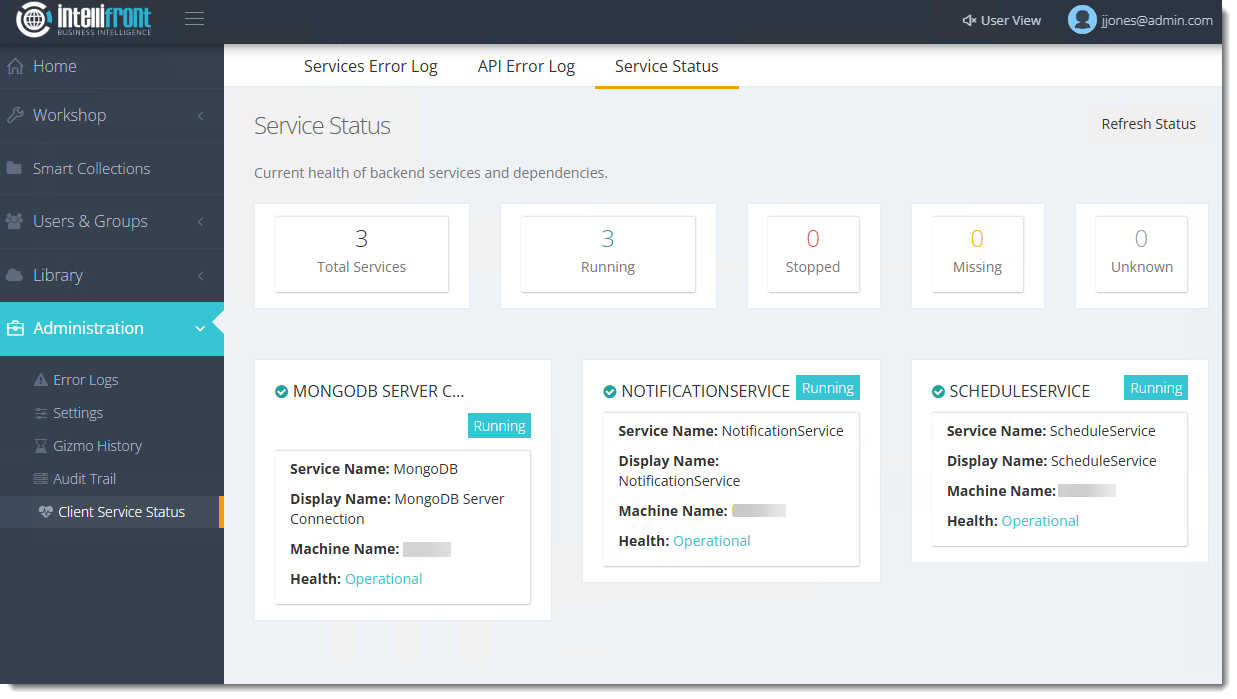 Here you can view and manage the Service Statuses of the backend services being used for Intellifront BI. You can also Refresh the status of these services.