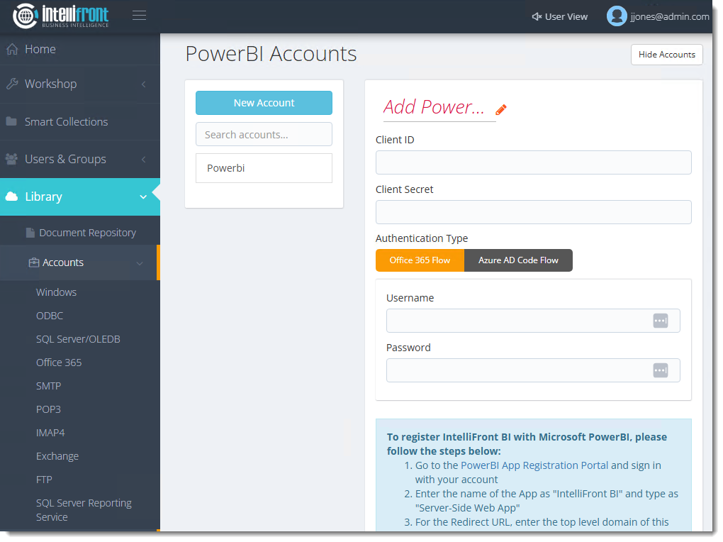 KPI's and Dashboards: Power BI Accounts in IntelliFront BI.