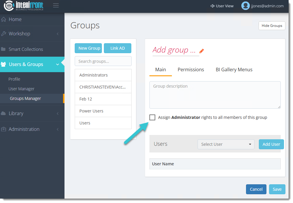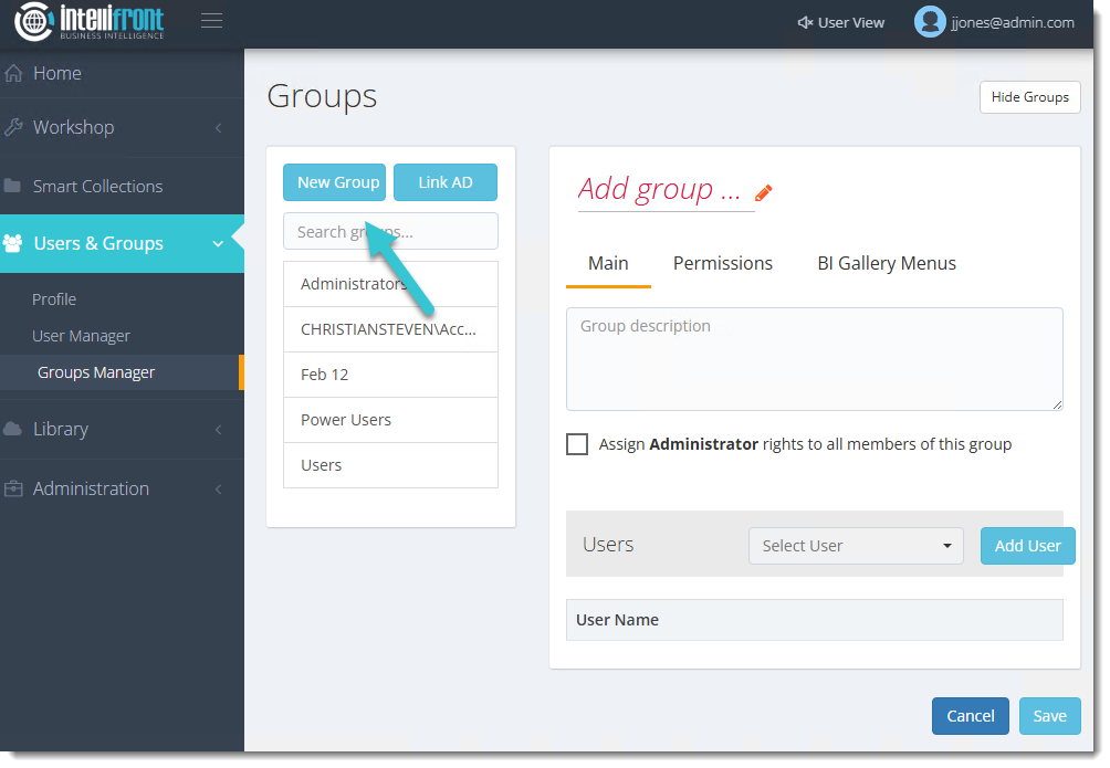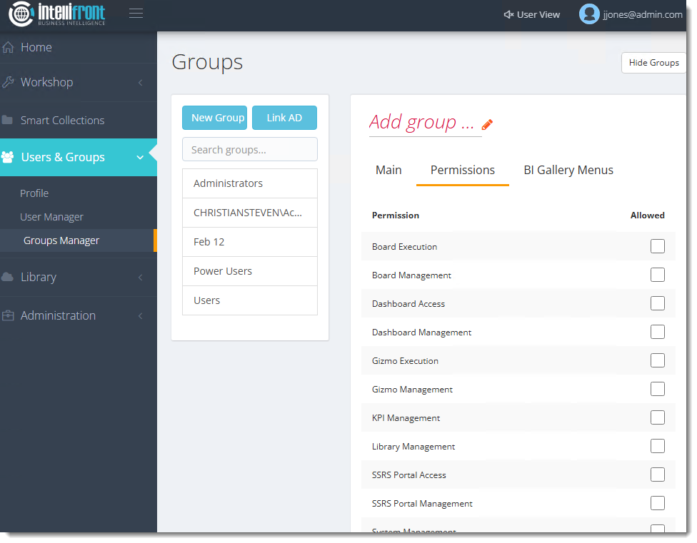 The Groups Manager section allows you to create, modify, and remove user groups. You have the option to connect the group to an Active Directory (AD) Group. By linking one or more users to a group, you can assign specific permissions for accessing different areas within IntelliFront BI. Users with User/Group Management rights will be able to access the Groups Manager.