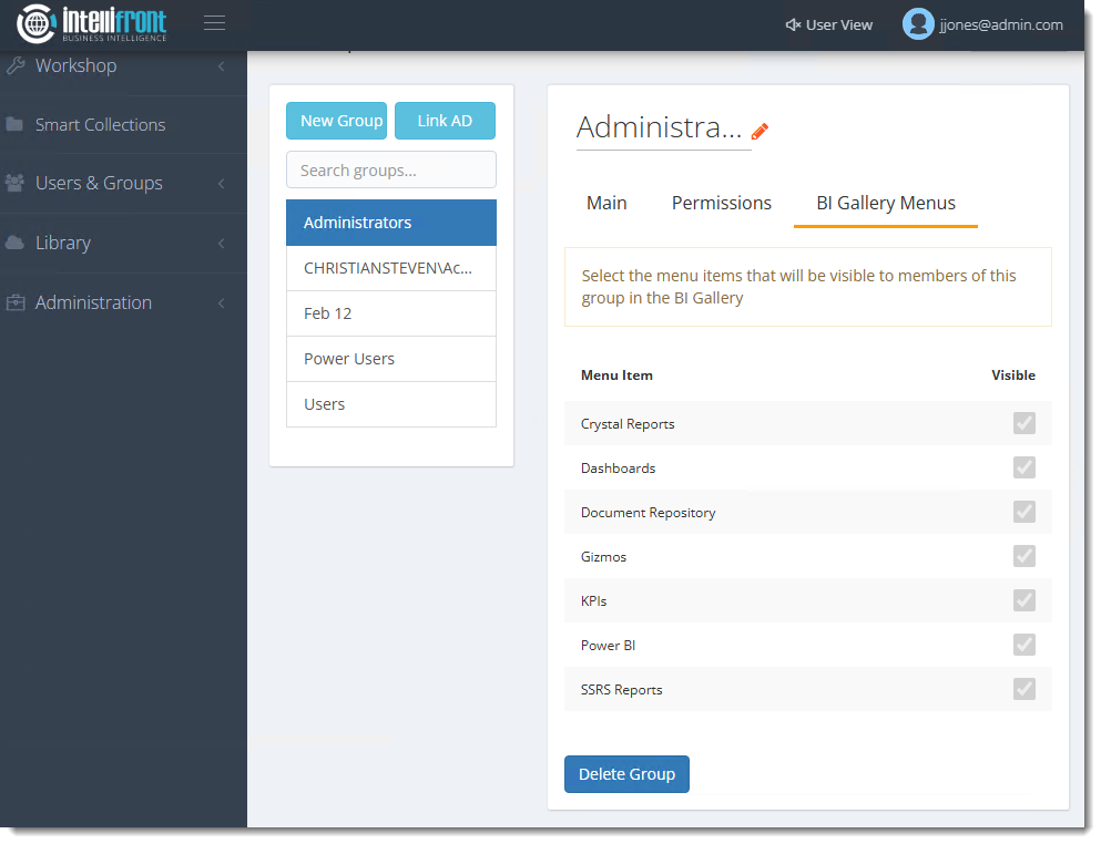 Step 5 -In the BI Gallery Tab, administrators can select the content that will be visible to Group members upon logging into IntelliFront BI. Simply choose the items that you want to be displayed for the group members.