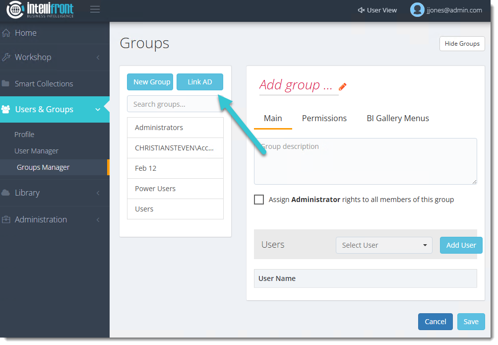 You have the option to connect the Group with an Active Directory (AD) Group. By doing so, you can associate one or more users with the group and specify the permissions they have for accessing different areas of IntelliFront BI.