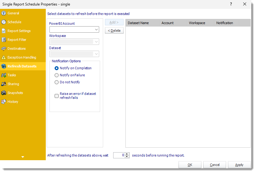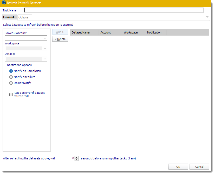 - After refreshing the datasets above, wait 'X' seconds before running other Tasks (if any) Enter the required amount of time in seconds the scheduler should wait after completion of the Dataset Refresh before running other Tasks.