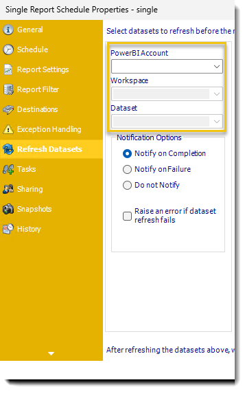 Step 3 - Complete the Notification Options. Receive a notification after the dataset refresh is completed, if the Dataset refresh fails, or choose not to receive a notification. You may also select whether or not you would like to Raise an error if the dataset refresh fails upon execution.