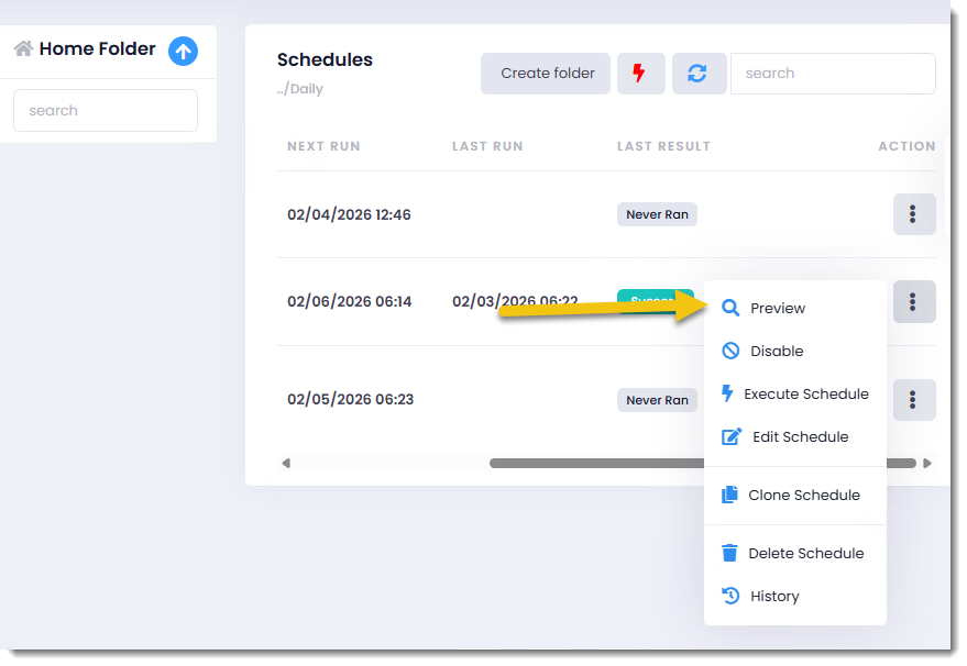 Step 1: To preview a schedule navigate to the Action Menu of the schedule and select Preview.