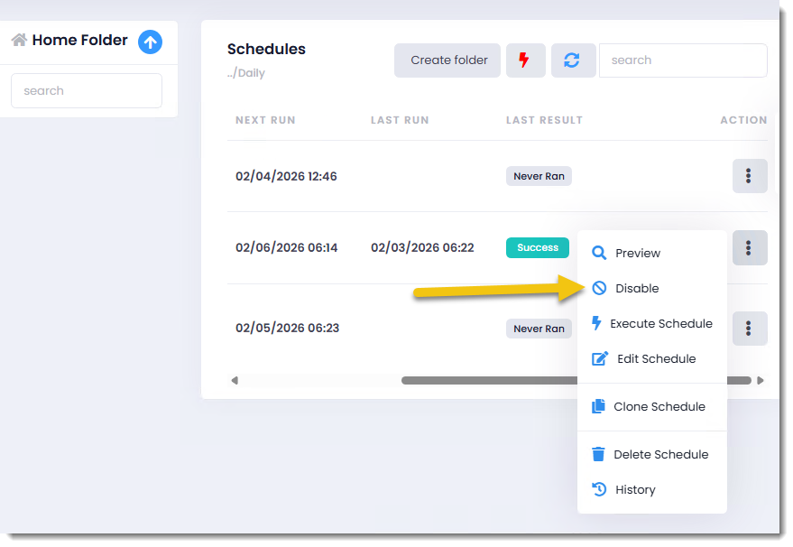 Step 1: To disable one schedule go to the Action Menu of the schedule and select Disable.