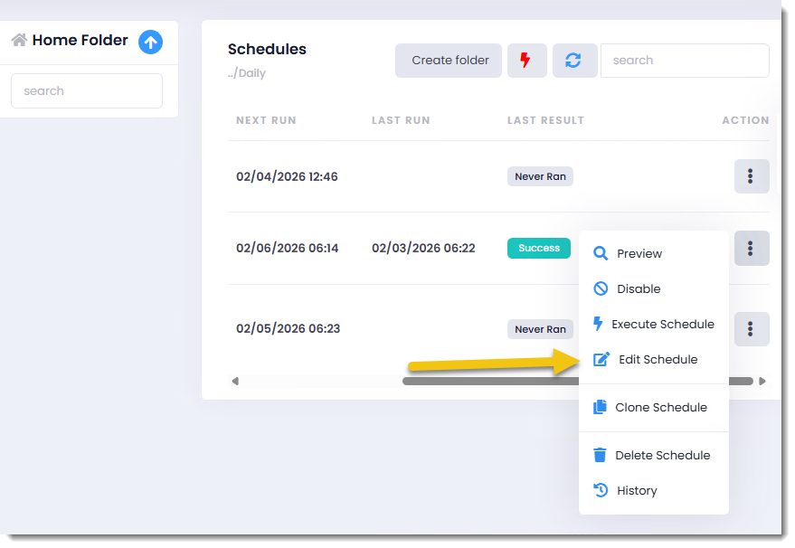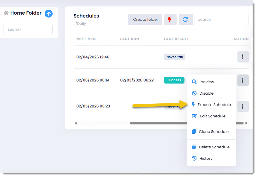 Step 1: To execute one schedule go to the Action Menu of the schedule and select Execute.