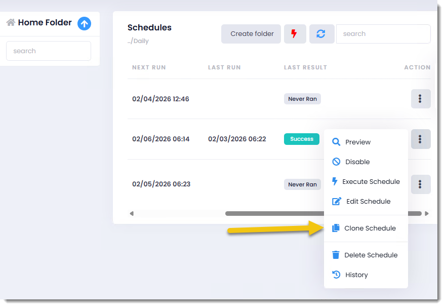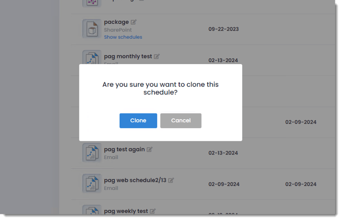 Step 2: A confirmation pop-up will appear, asking you to verify your intention to clone the schedule. Upon confirmation, the new schedule will appear in the same folder, labeled as "Clone of ScheduleName."