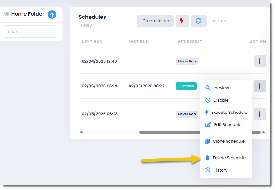 Step 1: To delete a schedule, go to the Action Menu of the schedule and select Delete Schedule.