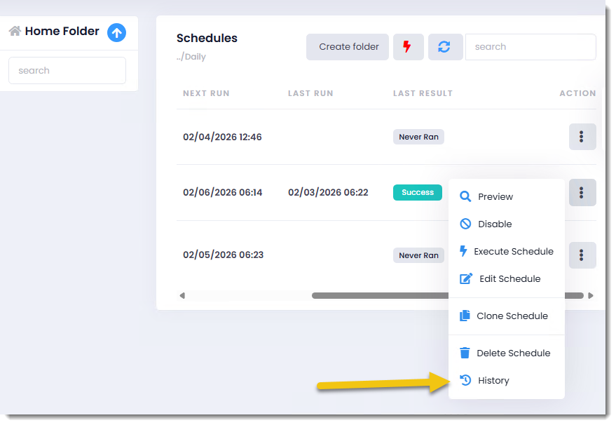 Step 1: View a schedule's history by clicking on the History button of the desired schedule.