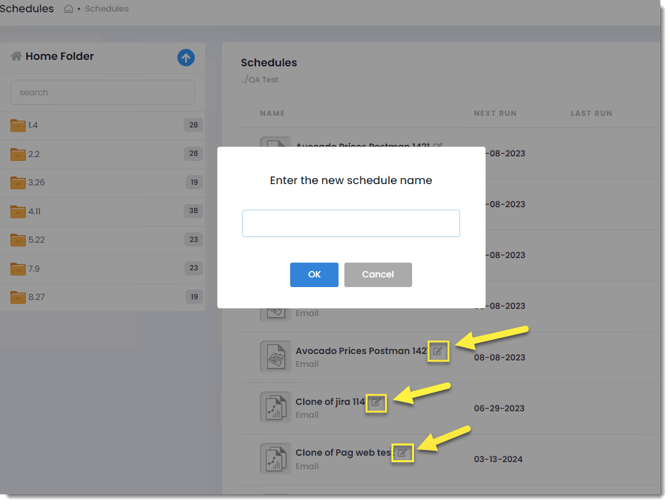 Step 1: Rename a schedule by clicking on the Rename symbol by a schedule and entering the new schedule name.
